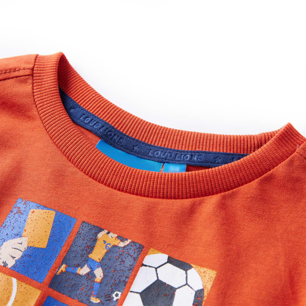 This kids' T-shirt has long sleeves, a round neckline, and a straight model. This orange T-shirt features football game. The children's long sleeve T-shirt is made from soft material with 80% cotton and 20% viscose for extra comfort and breathability.