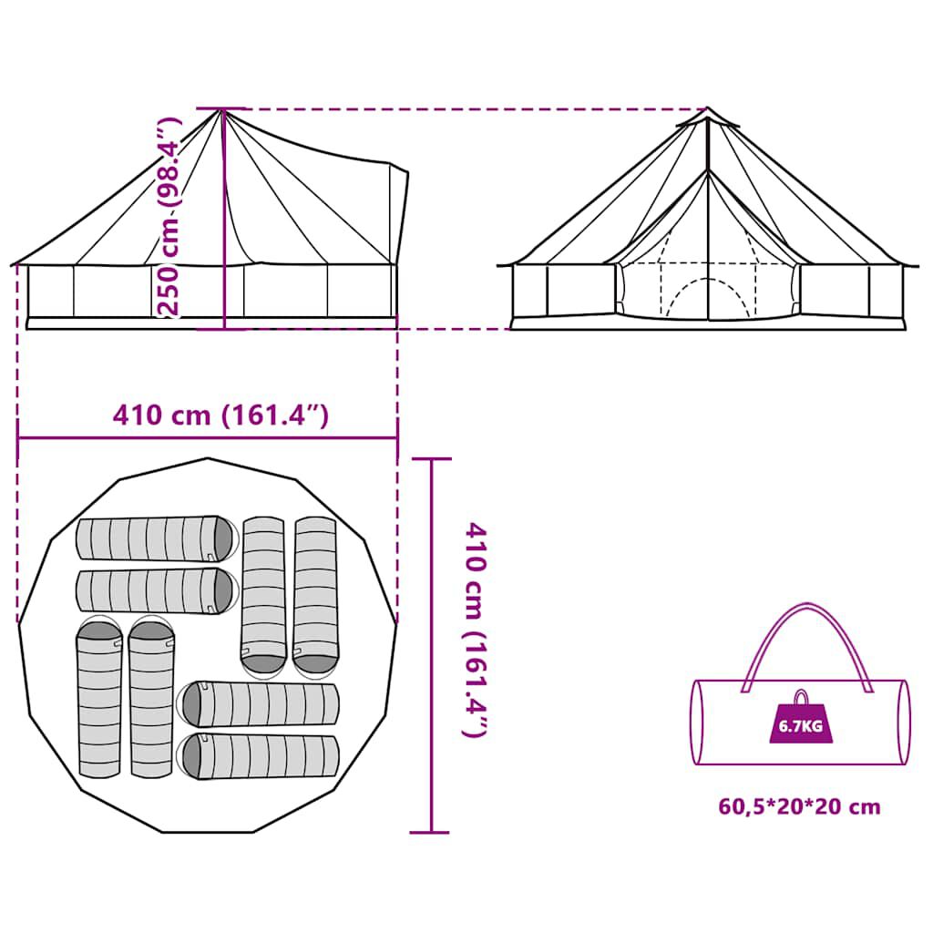 • Tent dimensions: 410 x 410 x 250 cm (L x W x H)