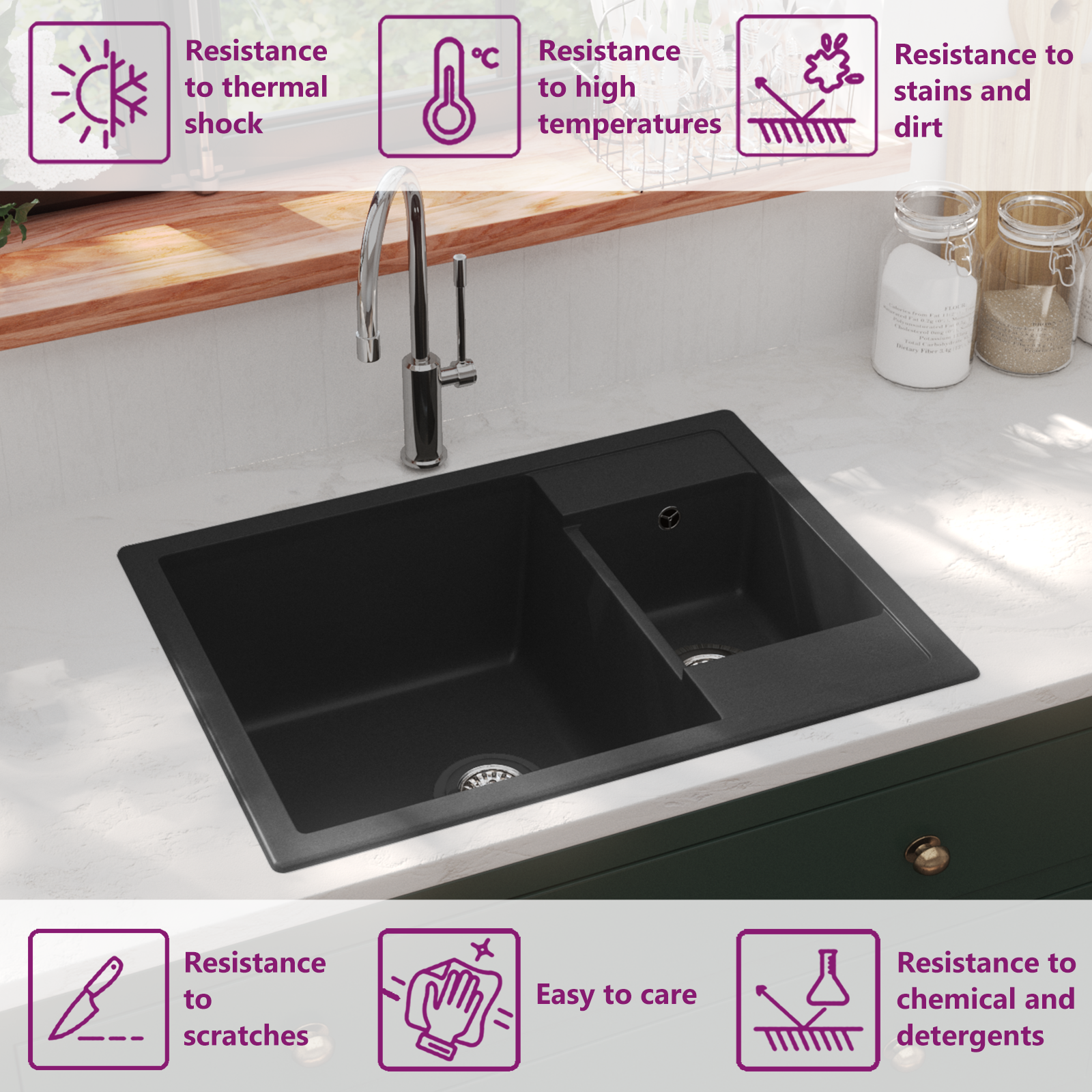 This granite kitchen sink is a timeless addition to your existing kitchen decor. It features an extra-deep basin , a small basin and a sleek design.