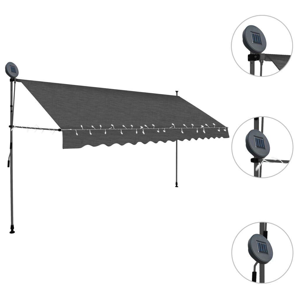 This water- and dirt-repellent and UV- and weather-resistant awning is made of quality polyester with a PU coating. The strong steel frame makes the awning sturdy and durable. The easy-to-clean polyester canopy can be removed and washed. Thanks to the handle crank, this awning is retractable. The height and the angle of the awning can also be adjusted. In addition, those solar-powered LED lights provide lighting at night. The awning is easy to assemble.