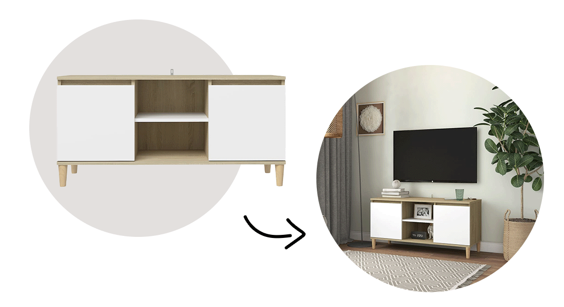 Opt for clean lines, uncluttered spaces, and a neutral colour palette to create a sense of peace. For example, a TV unit that combines a natural wood structure with white compartment doors. Store your stuff behind doors for a clutter-free feel, but leave a few items on the open shelving, for a pop of colour.